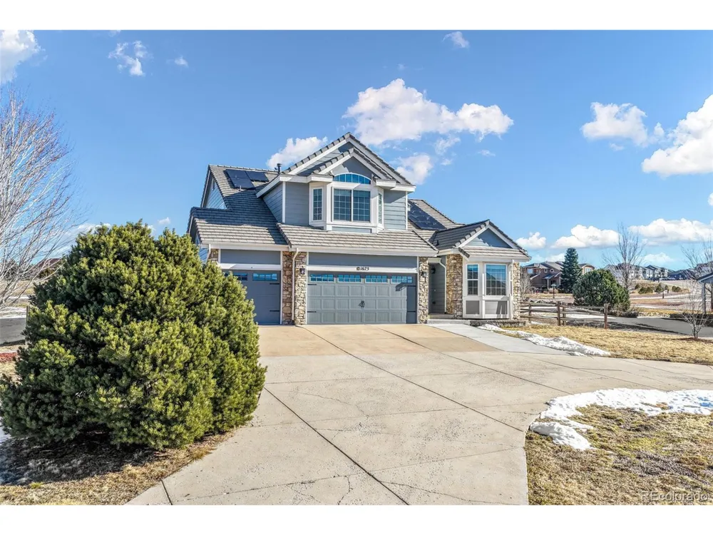 Beautifully updated and exceptionally well cared for two-story home in desirable Woodmoor Greens in Monument, set on a rare .63-acre lot backing to open space with sweeping Pikes Peak views. From the moment you arrive, the curb appeal stands out with a curved driveway offering extra parking and a spacious three-car garage. An added bonus are the paid-off solar panels, providing long-term energy savings and efficiency. Inside, the home features high ceilings and luxury vinyl plank flooring throughout the main level. The entry welcomes you with a dedicated office to the right and an elegant open staircase leading upstairs. A formal living room flows seamlessly into the formal dining room, perfect for gatherings. The kitchen offers abundant cabinet and counter space, a beautiful tile backsplash, double ovens, a large island, and an attached eat-in area with direct access to the expansive backyard. The kitchen opens to the family room, featuring a stone-surround fireplace with a wood mantle. The main level also includes a full bathroom with a tub/shower combination and a convenient laundry room. Upstairs, the spacious primary suite features an updated bathroom with dual vanities, updated cabinetry, a freestanding tub, large walk-in tile shower, radiant floor heat, and a custom closet system. Three additional bedrooms complete the upper level, two of which share a Jack-and-Jill bathroom. Large windows throughout provide abundant natural light. The unfinished basement offers rough-in plumbing for a future bathroom and endless potential. Additional features include central air conditioning and a large fenced backyard with pergola, ideal for enjoying Colorado's outdoor lifestyle and incredible views. With easy access to I-25 and located near beautiful downtown Monument, within walking distance of Lewis-Palmer High School, the location truly doesn't get much better than this.