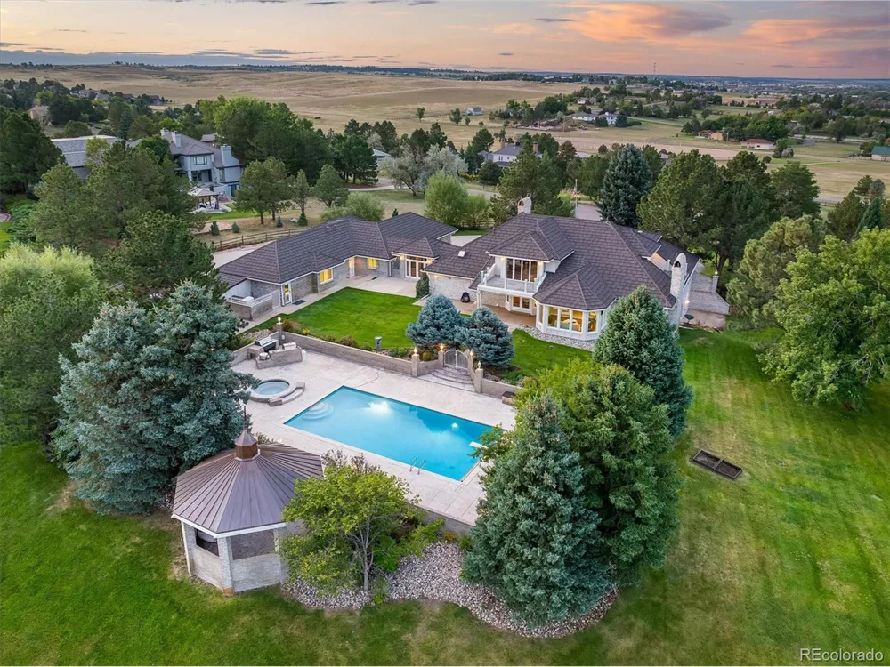 Discover luxury living in Centennial's exclusive Chenango community at 17575 E Kettle Place. This custom-built 6-bedroom, 5-bathroom estate perfectly blends privacy, mountain views and high-end design. Nestled on acreage with a gated driveway on a quiet cul-de-sac, this property captures breathtaking panoramic views of the Colorado Rockies from Long's Peak to Pikes Peak. The gourmet kitchen is a chef's dream, featuring Viking, Sub-Zero, and Wolf appliances, Crystal Cabinetry, and generous prep and storage space. Entertain in style in the formal dining room, vaulted great room, and sunroom designed for year-round enjoyment. The Architectural Digest-worthy Primary Suite showcases a nano glass wall, two private decks, coffee bar, custom walk-in closets, and a spa-inspired bath with a Carrera Italian marble soaking tub and steam shower. The finished walkout basement includes a custom bar, media area, steam shower, and ample room for gatherings. Car enthusiasts will appreciate the 9-car garage with 2 lifts, while equestrians will love the barn with wash bay, heated tack room and room for your horses to roam. Step outside to your private resort-style oasis complete with a heated pool, hot tub, built-in outdoor grill, smoker, fire pit with plenty of space to gather around, and a copper-roof gazebo. Perfect for entertaining or relaxing under Colorado's blue skies. No need to travel to a resort when you have your very own right at home. Major updates include new HVAC, windows, reverse osmosis system, a $500,000 new roof, and a state-of-the-art security system. Conveniently located near Centennial Airport, E-470, downtown Parker, DTC, shopping, and dining, this home delivers both luxury and accessibility. Experience the best of Colorado luxury living, schedule your private showing today to see this Chenango estate now offered at $2.9 million.