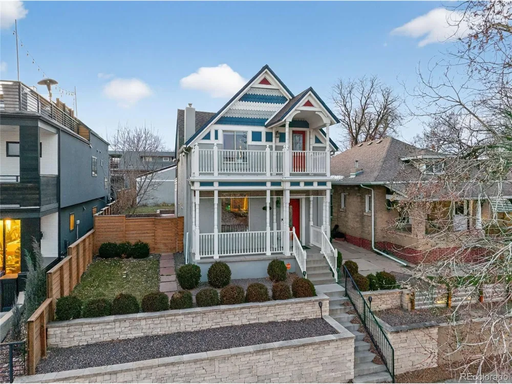 Welcome to 2021 Eliot St, a beautifully updated Victorian Home in Jefferson Park. Enjoy living on a quiet cul-de-sac in Jefferson Park with the most amazing unobstructed view of Downtown Denver! This house is full of original charm while offering the modern conveniences of today, including fully paid-off solar panels for energy efficiency and long-term savings. On the main floor you will find the living room with a fireplace, dining room, and stunning updated kitchen with a huge island perfect for entertaining. Also on the main floor is a bedroom that could be another bonus room / office with a 3/4 bath as well as a laundry room. Upstairs you will find two Primary Suites as well as a walk-out upstairs deck. There is additional finished square footage in the basement that could be an office or great storage space. The front porch patio and Juliette balcony provide unparalleled views of the Denver skyline! Enjoy a soak in the new hot tub or BBQ before a Broncos game with friends. The home also includes fully designed plans and construction drawings for a new garage with an ADU apartment on top.