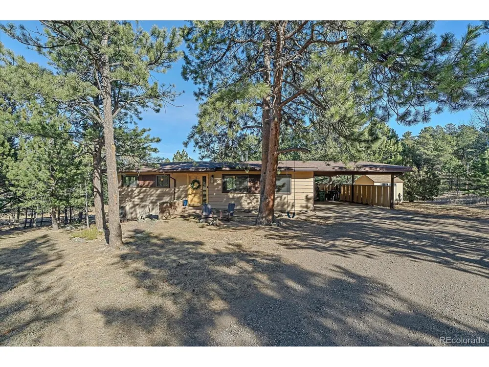 Stunning remodel on one of Hiwan's premier lots. This one really is special. A gentle driveway leads you across this park-like acreage where this sweet home awaits. The great room has been totally remodeled with careful detail to attention. The gas fireplace highlights the living space and it is open to the dining and kitchen areas just beyond. The dining area can be home to your largest dining set and the kitchen island provides barstool seating as well. The kitchen has been masterfully designed with a gas stove and gorgeous cabinetry. The dining opens onto a large (and private!) deck with built-in seating bench. There is also space in the living room for a game table or desk space. The upper primary suite offers a gentle vaulted ceiling and dual closets. You can add an access door for direct access to the fully remodeled bathroom. A secondary bedroom enjoys backyard vistas. Main level laundry is also located in a separate room. A newer staircase leads you to the lower level where you will be greeted be a huge family room with another gas fireplace. This is an optima area for TV watching, workout equipment or hobbies. A second primary suite is on the level and enjoys a large walk-in closet. The 4th bedroom has natural light and area for desk space. Another fully remodeled bathroom has a large walk-in shower, dual sinks and separate water closet area. Moving to the outside, a 2 car attached carport (mostly enclosed on 3 sides) offers an escape from the elements and has storage in back (and there is a shed as well). The acreage affords endless activities for people, kids, dogs or just the privacy. You will enjoy the south-western views, sunny location and easy access to all Evergreen has to offer.