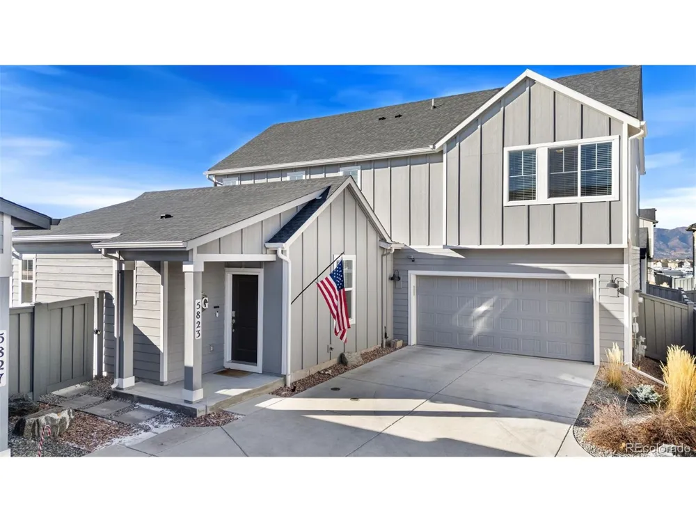 Welcome to this beautifully designed Moonflower two-story plan in The Foursquare Collection at Pathways, built by Classic Homes in 2022. This thoughtfully crafted 3-bedroom, 2.5-bath home includes a main-level den and a spacious 2-car garage, offering both style and functionality. The main level features wide plank flooring and an open, inviting layout. The kitchen is a standout with white cabinets accented by crown molding, quartz countertops, a classic white subway tile backsplash, and stainless steel appliances including a gas range and refrigerator. The spacious great room flows seamlessly and is perfect for entertaining. Enjoy your Colorado lifestyle with the outdoors and views through a large sliding glass door that opens to a covered patio, perfect for enjoying Colorado evenings. Upstairs, the primary suite offers Pikes Peak views and features a generous walk-in closet with an adjoining spa-inspired bath with a resort-style walk-in shower. Two additional bedrooms, a full bath, and a spacious upper-level laundry room add everyday convenience. The interior finishes showcase a neutral palette of whites, beige, and ash tones, complemented by chrome and brushed nickel fixtures throughout. The fully landscaped yard and privacy fencing complete the outdoor space. As a bonus, the garage is equipped with a separate HVAC wall system and upgraded workshop cabinets with counter space, ideal for hobbies, projects, or climate-controlled storage. Located in a desirable north-east community with easy access to local amenities, parks and trails. This home blends modern comfort, thoughtful upgrades, timeless design and is better than new. Book your showing today.