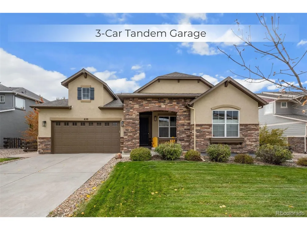 Beautiful ranch home with a 3-car tandem garage and finished basement! Located in the Boulder Valley School District, surrounded by trails, open space, and easy access to Boulder, Denver and DIA - providing both convenience and access to the outdoors. The main floor features high end upgrades and hardwood flooring, a French-doored office, a formal dining room with custom lighting, and a spacious great room with a gas log fireplace, built-ins, and access to the outdoors. The gourmet kitchen includes granite counters, a large center island, custom pendant lighting, double convection ovens, a gas cooktop, and a pantry-perfect for gathering. The primary suite boasts tray ceilings and a 5-piece bathroom with dual walk-in closets. A secondary main-floor bedroom also includes a private en suite bathroom. The fully finished basement provides additional living space with a large recreation room and wet bar with pendant lighting, perfect for gatherings. A third bedroom and full bathroom complete the basement level. Step outside to the very private, fully fenced and landscaped backyard, featuring a huge patio, pergola, and a grassy area-ideal for entertaining. Between Old Town Erie and Old Town Lafayette, this home offers easy access to dining, shopping, nearby parks, and the Erie Recreation Center for endless outdoor activities. Near Hwy 287 and I-25 make commuting to Boulder, Denver, and DIA easy. Don't miss out on this high-end, upgraded ranch home with a finished basement and exceptional outdoor entertaining spaces!