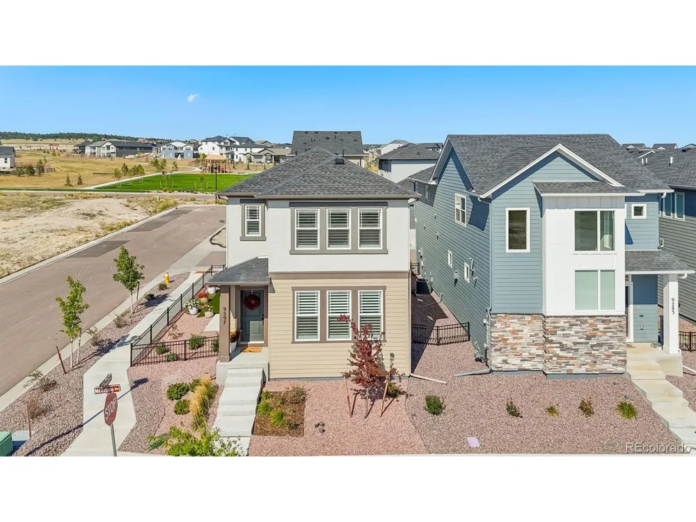 Welcome to this stunning 2-story home on a corner lot in the Revel Crossing community of Wolf Ranch. This residence showcases the most luxuriously updated Calista floor plan available, with thoughtful upgrades and elevated finishes that set this home apart. The open great room concept is the heart of this home, blending comfort and function in one inviting space. A cozy gas fireplace and custom wood shelving anchor the living area, while expansive windows with plantation shutters fill the room with natural light. The chef's kitchen features a gas cooktop grill, built-in oven, designer vent hood, 42" upgraded cabinetry, granite countertops, and stainless-steel appliances, with an effortless flow into the dining area. From here, step directly outside to the fenced side-yard, a perfect extension of the entertaining space for dining al fresco or simply enjoying the views from outdoors. Upstairs, you'll find three spacious bedrooms and two bathrooms, including a serene primary retreat with a large walk-in closet, an ensuite featuring a super shower with herringbone tile surround, and double vanity sinks with granite countertops. Wake up each morning to breathtaking mountain views, including Pikes Peak. Additional highlights include custom shelving in the laundry room, a convenient powder room on the main level, and a two-car garage. The home's west-facing orientation offers glowing sunsets and warm light throughout the day. The home is equipped with a tankless water heater and central air. Located in a low-maintenance community where the HOA maintains the grounds, you'll enjoy more free time to explore nearby Wolf Lake, miles of walking trails and community parks, Briargate Parkway dining, the Promenade Shops, and access to highly rated D-20 schools. Memorial North Hospital and Children's Hospital are just minutes away, adding peace of mind and convenience. This property perfectly blends luxury, comfort, and location.